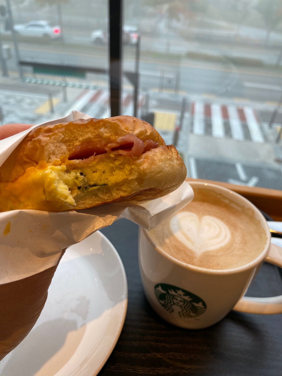 아침식사를 하지 않은 상태로 라이딩을 시작했는데, 가을 새벽 찬 공기에 몸도 조금 추웠고, 아침 식사도 할 겸 스타벅스에서 잠시 머물기로 했어요.