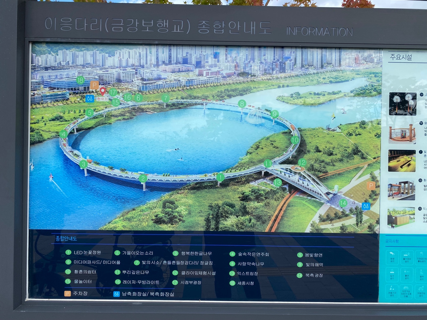 스타벅스에서 금강보행교에 도착을 하면 이응다리의 남쪽 출입구가 나와요. 남쪽 출입구는 세종 시청쪽인데 시청부근이다보니 맛집이나 카페들 접근성이 괜찮아요.