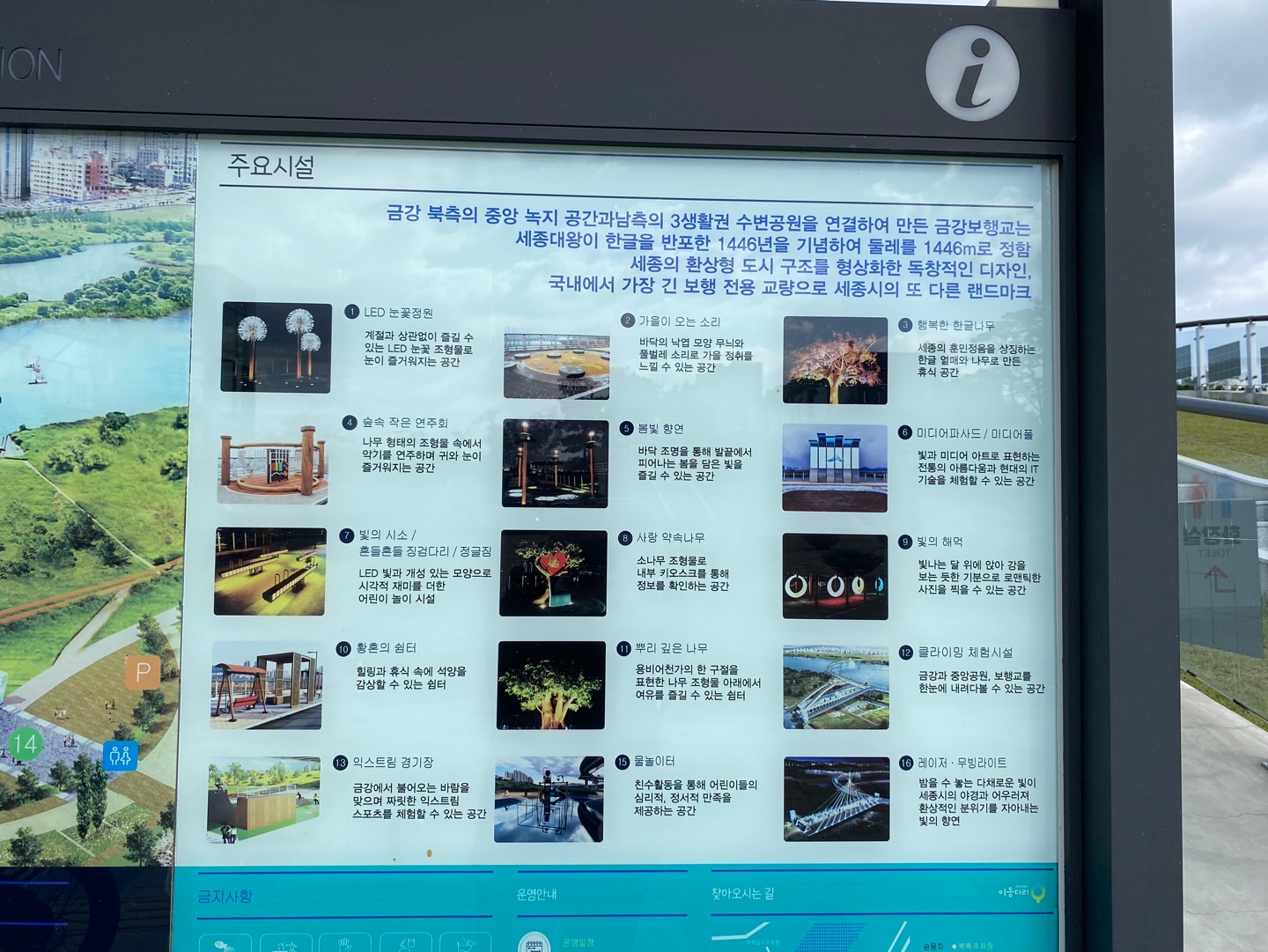 그리고 요즘 자전거 라이딩으로 자전거길 종주 하는 분들이 많은데요, 금강 자전거길로 라이딩을 하시는 분들이라면 북쪽 출입구쪽으로 가시면 안되고 남쪽 출입구쪽에서 이동하셔야 금강자전거길을 이용해서 세종보까지 이동하실 수 있으니 이 점도 참고하시면 좋겠어요.