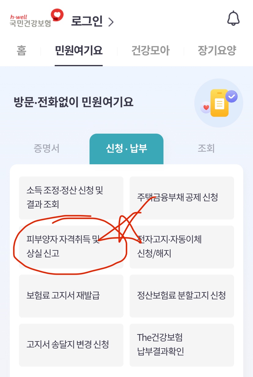 - 홈페이지: www.nhis.or.kr → 민원서비스 → 서비스찾기→서비스유쳥 ‘신고/신청’에 체크
