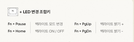 백라이팅은 전에 쓰던 키보드처럼 화려한 기능이 있는건 아니지만 백라이트 모드 2가지로 변경이 가능하고, 밝기도 조절할 수 있어요.