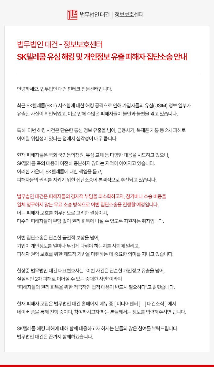 이에 법무법인 대건 정보보호센터에서는 피해자들의 권익 회복을 위해 무료 집단소송을 추진 중입니다. 이번 소송은 소송비용이나 참가비 없이 진행되며, 누구나 부담 없이 참여할 수 있습니다.